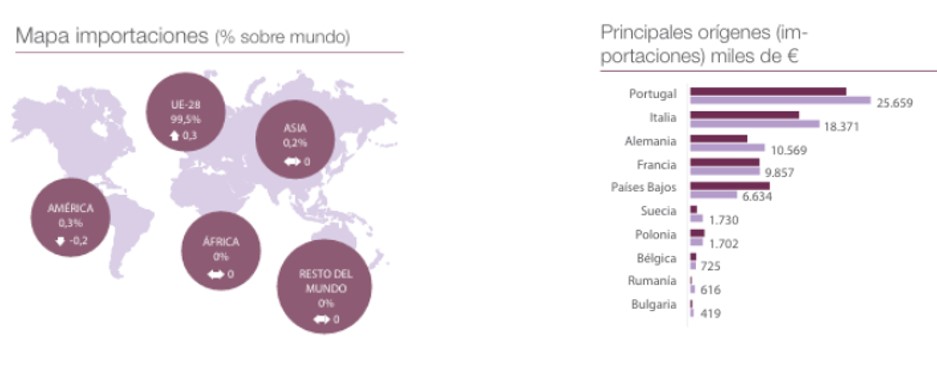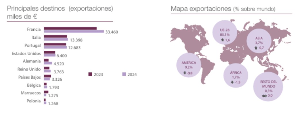 En cuanto a los mercados de destino, marcados evidentemente por las características de duración del producto, Francia (33,5 M€) sigue liderando con autoridad, con un crecimiento en valor en línea con la media pero más moderado en volumen. Le sigue Italia (13,4 M€), cuyo comportamiento es el contrario: menor crecimiento en valor pero mayor en volumen. Portugal (12,7 M€) completa el top 3 con el mayor diferencial entre valor y volumen (+27,3 p.p.), reflejando un avance muy dinámico pero también desequilibrado.