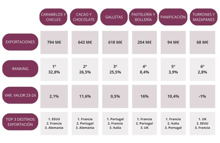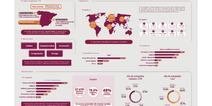 El mercado nacional alcanzó los 5.357 millones de euros (+1,4 %), mientras que las exportaciones superaron los 2.400 millones de euros (+5,3 %), situando al dulce como el quinto exportador de la industria agroalimentaria. La balanza comercial se situó en 881 millones de euros.