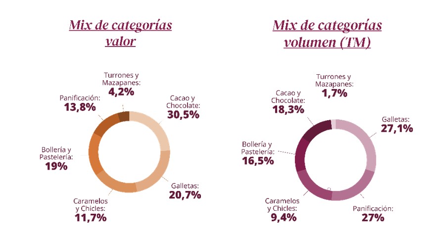Todas las categorías que conforman el sector han crecido durante el pasado año en términos de consumo, con el cacao y chocolate liderando los segmentos (2.106M€), seguido por galletas (1.428M€), pastelería y bollería (1.310M€), panificación (954M€), caramelos y chicles (809M€) y turrones y mazapanes (290M€). Este desempeño refleja la alta calidad, competitividad e innovación de los productos españoles y la confianza continua del consumidor.