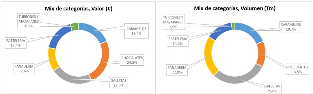 El 2023 continuó afectado por la inflación en todas las categorías de productos. El sector viene realizando un ejercicio de contención para paliar estos efectos, buscando el menor impacto posible en la cesta de la compra. Todas las categorías que conforman el sector han crecido durante el pasado año en términos de consumo, con el cacao y chocolate liderando los segmentos (1.968M€), seguido por galletas (1.402M€), pastelería y bollería (1.288M€), panadería (946M€), caramelos y chicles (733M€) y turrones y mazapanes (278M€). En términos de volumen, las galletas mantienen la mayor representatividad, seguidas por panadería y caramelos y chicles. Este desempeño refleja la alta calidad, competitividad e innovación de los productos españoles.