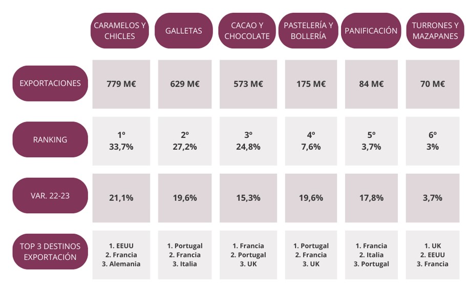 En el análisis por categorías, caramelos y chicles se afianzaron en la primera posición de las ventas al exterior del sector, con unas exportaciones de 779 millones de euros. Le siguieron galletas (629 millones), cacao y chocolate (573 millones), bollería y pastelería (175 millones), panificación (84 millones) y turrones y mazapanes, que con 70 millones de euros se posicionaron no obstante como la tercera mayor contribuyente al saldo comercial del sector.